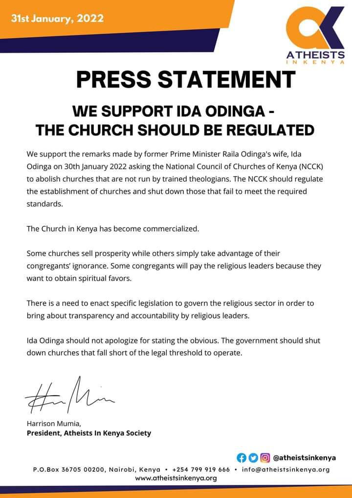 Atheists in Kenya have expressed their support of Ida Odinga who over the weekend insisted that churches should be regulated.