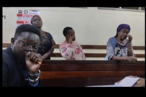 From right, Betty Akinyi Nyanya, Sarah Adhiambo Oloo and Flavian Ademi before Makadara law courts Chief Magistrate Hon Beatrice Kimemia.